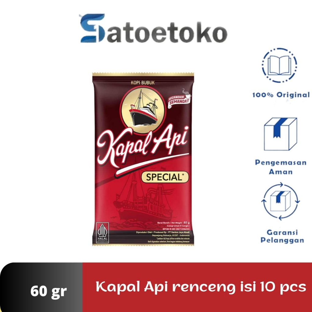 "Kopi Kapal Api terbuat dari biji kopi pilihan dan diproses dengan mesin yang paling modern yang menghasilkan kopi berkualitas tinggi dengan Aroma terbaik dan Rasa yang enak. Mulai hari Anda dengan secangkir semangat untuk Indonesia dengan Kopi Kapal Api. Dengan kemasan ukuran 60 gram.