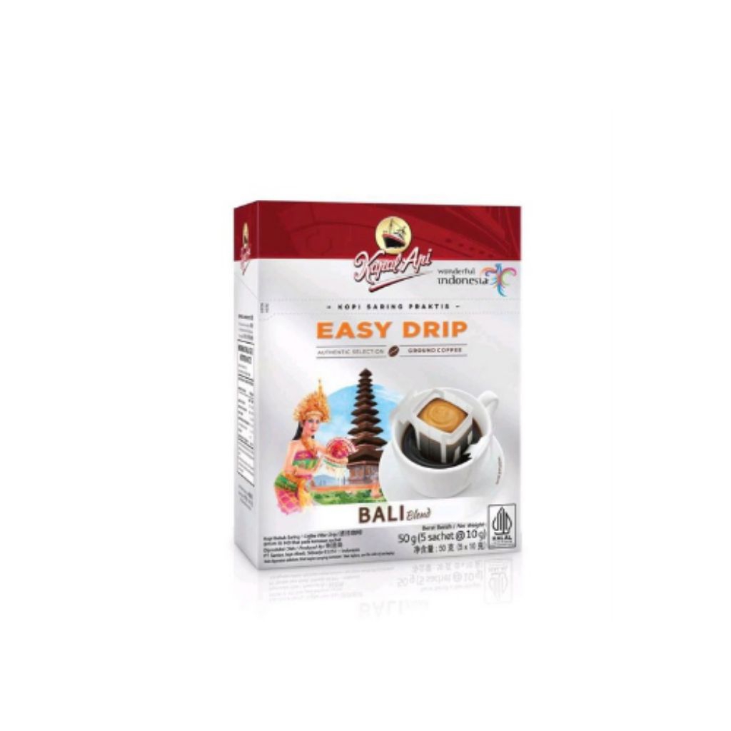 Paduan kopi pilihan dan kopi Arabika dari bali. Kopi ini ditanam di dataran tinggi Bali dengan menggunakan sistem pengairan tradisional sehingga menghasilkan cita rasa unik dan khas. Kombinasi yang pas dalam kemasan kantong saring (drip bag) membuat Kapal Api Easy Drip Bali mudah disajikan serta bebas ampas.