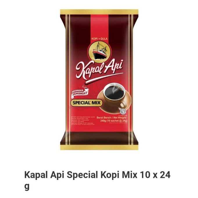 Kapal Api Special Mix 10 x 24 g adalah salah satu kopi sachet yang menjadi kesukaan penikmat kopi di Indonesia. Diracik dari biji kopi pilihan Indonesia dan diolah dengan teknologi mesin kopi modern. Berpadu dengan baik bersama gula murni, menghasilkan kopi sachet tubruk paduan kopi dan gula yang spesial untuk setiap penikmat kopi di Indonesia. Hadir dengan kemasan sachet yang praktis sehingga mudah diseduh di mana saja dan kapan saja. Menjadikannya tetap Kapal Api yang memiliki jargon "jelas lebih enak" dan pilihan para penikmat kopi Indonesia sejak tahun 1927.