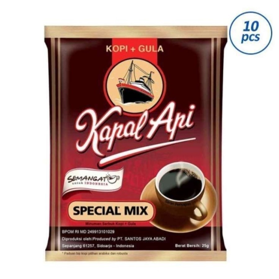 Kopi Kapal Api terbuat dari biji kopi pilihan dan diproses dengan mesin yang paling modern yang menghasilkan kopi berkualitas tinggi dengan Aroma terbaik dan Rasa yang enak. Kapal Api Special Mix Dibuat dari Biji kopi pilihan yang diolah dengan mesin yang paling modern dan campuran gula murni. Menjadikannya paduan spesial dari kopi dan gula. Kemasan Praktisnya, membuat kopi anda siap seduh dengan aroma kopi senikmat selera pilihan. Mulai hari Anda dengan secangkir semangat untuk Indonesia dengan Kopi Kapal Api
