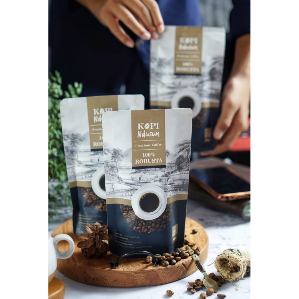 Kopi ndusun 100% robusta adalah kopi bubuk robusta murni dalam kemasan khas bumi reyog ponorogo. Terbuat dari biji kopi robusta murni yang diproses dengan tingkat kematangan yang pas sehingga menghadirkan cita rasa dan aroma serta sensasi kenikmatan kopi sejati.