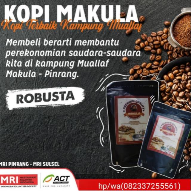 100 % kopi asli, terbuat dri biji kopi pilihan langsung dari perkebunan kopi pedalaman di makula Sulawesi Selatan, kenikmatan dan aromanya tdk diragukan lagi, para penikmat kopi di seluruh Indonesia dimana pun anda berada kenapa anda harus membeli prodak yg kami pasarkan...? Karena disetiap pembeliannya akan di donasikan untuk aksi kemanusiaan, jadi bukan saja nikmatnya yang anda rasan tapi orang lain juga akan merasakan nikmatnya sedekah dari anda .