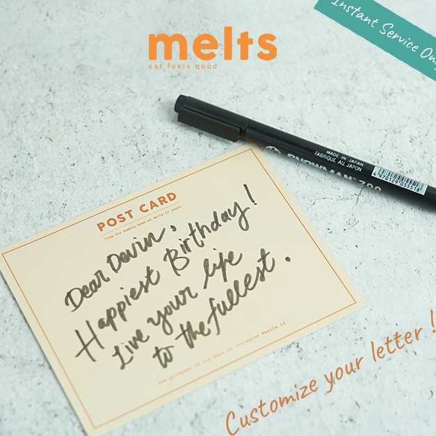 110624 | SP MELTS INSTANT SERVICE adalah official store Meltsid khusus melayani pengiriman & GOSEND area jaka dan sekitarnya. jika pengiriman diluar jangkauan dan , silahkan ke official store MELTS kami di https://shopee/meltscookies atau search toko kami "Meltscookies" Tersedia ONGKIR di "meltscookies" Collaterals Set for Melts Gift ! 3 set of Cards berisi : - Recipe ideas untuk melts product - Product info - Include penulisan yang dapat kamu request untuk ditulis tangan oleh team kami. (detail tepat di slide 2 foto) *set kartu dilengkapi dengan sleeve kalkir Dengan tambahan collateral set , pesananmu akan lebih mengesankan dan cocok untuk jadi hadiah ! Impont Info Untuk Card dapat di isi Dear dan From & bersifat WAJIB tulis di notes sebelum check out. Contoh : Notes : "Hi devin ! Happy Graduation , stay safe and stay healthy !" Jika tidak ada tulisan apapun di notes, kami akan kirimkan Kartu ucapan saja tanpa tulisan. Dikarenakan pesanan tanpa notes tidak akan muncul apapun di dalam resi, dan packer tidak akan tau pesan anda. Happy Shopping and happy Giving ! DENGAN MEMBELI PRODUK INI 100% SETUJU DENGAN SYARAT DAN KETENTUAN DIATAS NB : Mohon untuk mengkonfirmasikan atau memberikan feedback apabila barang sudah diterima pembeli. Terima kasih. ~~>>>> Kepuasan pelanggan adalah tujuan utama kami >>>>> Terima Kasih Atas Kunjungan Anda RESELLER & DROPSHIPER WELCOME