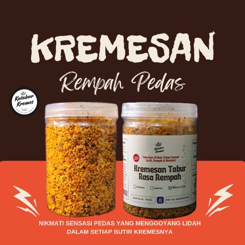 Varian Kremes Rasa Rempah Pedas dari Kutabur Kremes, memanjakan anda penggemar sensasi pedas, cocok ditabur pada nasi panas, sebagai pelangkap lauk, maupun disantap sebagai kupadan. Rasa pedas yang bertemu dengan rempah menjadikan kremesan kami berbeda. Dibuat dari bahan baku dan bumbu pilihan dengan teknik memasak yang meminimalkan kadar minyak dlm produk, membuat Kremesan Rasa Rempah Pedas ini bisa dinikmati kriuknya sampai butir terakhir.