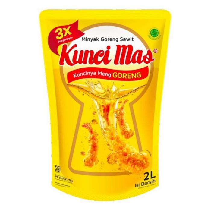 Minyak makan atau minyak goreng adalah satu dari sembilan bahan pokok yang secara umum sangat dibutuhkan oleh masyarakat. Oleh karena itu, saat ini ada banyak merek minyak makan yang beredar di pasaran luas. Kunci Mas salah satunya. Kunci Mas merupakan produk minyak goreng yang diproduksi oleh PT. Sinar Mas Agribusuness and Food. Sebagai salah satu produsen Minyak Goreng terbesar di Indonesia, Kunci Mas hadir dengan kualitas tinggi yaitu 3x penyaringan, sehingga menghasilkan Minyak dengan warna kuning keemasan yang jernih. Tidak hanya itu saja, Kunci Mas juga telah diproses secara higienis serta diformulasikan secara khusus agar hidangan yang dihasilkan menjadi lebih sempurna. Sebagai minyak goreng berkualitas Premium, Kunci Mas tersedia dalam tiga model kemasan, yakni kemasan plastik (Pouch), botol dan jeriken 5 liter. Jadi, tunggu apa lagi? segera beralih pada Minyak Goreng Kunci Mas sekarang juga.