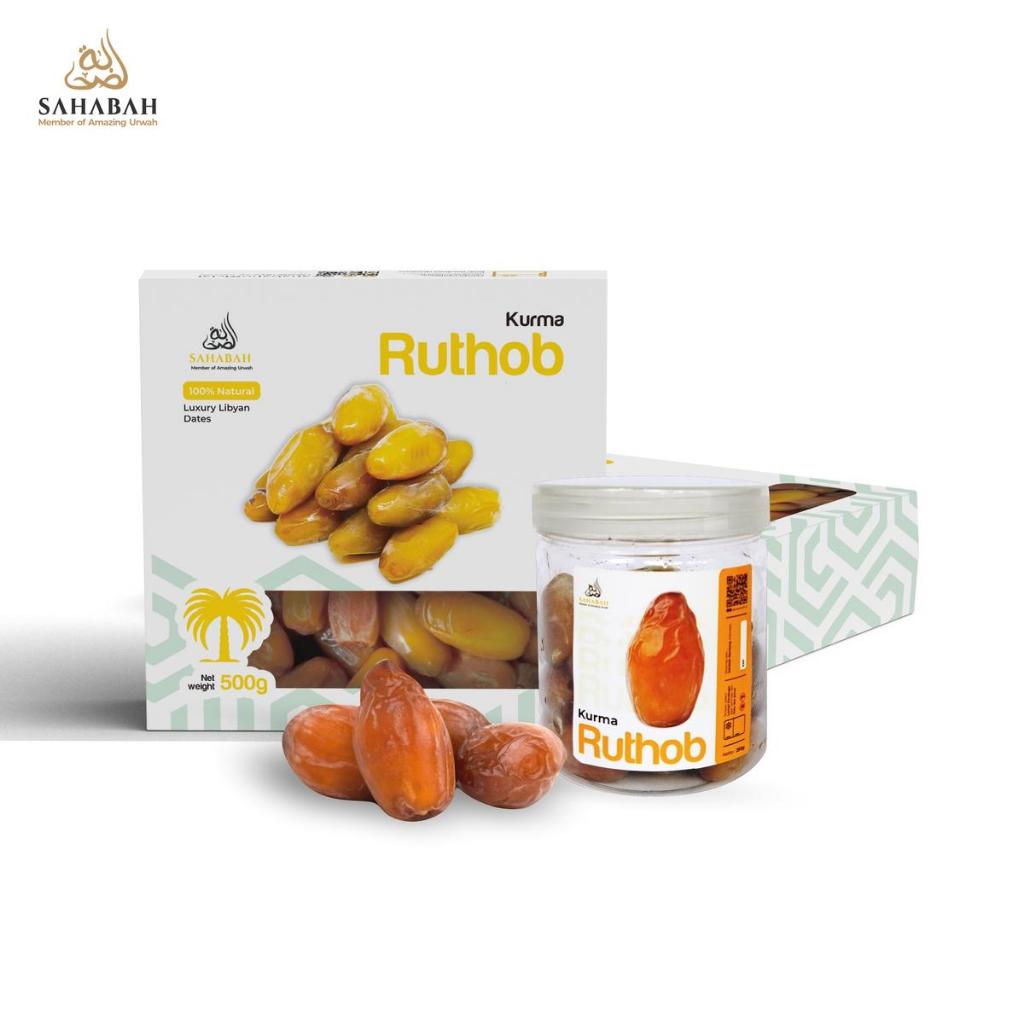 Kurma Ruthob Sahabah merupakan kurma Sahabah Premium yang disortir sebelum dikemas. Buah kurmanya besar dan segar. Kurma Ruthob Sahabah merupakan kurma basah dengan teksturnya masih renyah layaknya tomat mentah, tidak seperti kurma matang yang sudah lembek dan sedikit liat. Sementara rasanya tidak terlalu manis dan ada sedikit sepat seperti buah sawo. Buahnya lonjong dan berwarna kuning.
