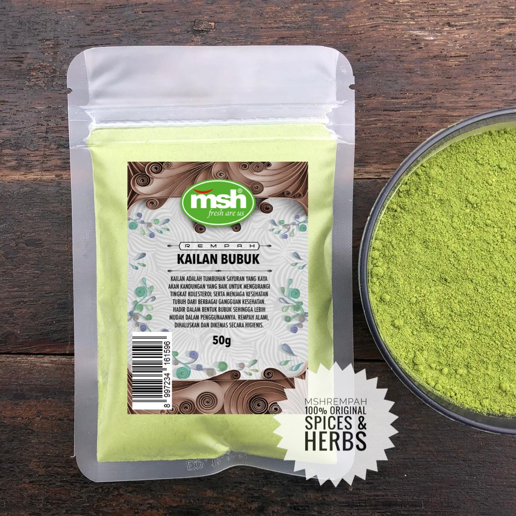 Kailan Bubuk merupakan bumbu rempah bubuk yang dapat digunakan sebagai campuran berbagai jenis makanan. Kailan adalah tumbuhan sayuran yang kaya akan kandungan yang baik untuk mengurangi tingkat kolesterol serta menjaga kesehatan tubuh dari berbagai gangguan kesehatan.