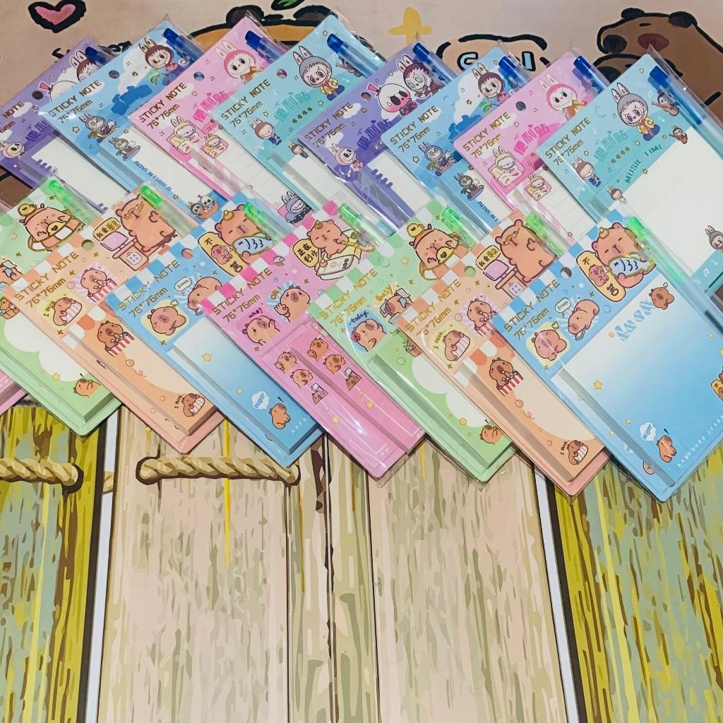 - Sticky note dengan karakter capybara dan labubu yang lucu, ada perekat di tiap bagian lembarnya. Bisa digunakan untuk mencatat dan bisa dibawa kemanapun