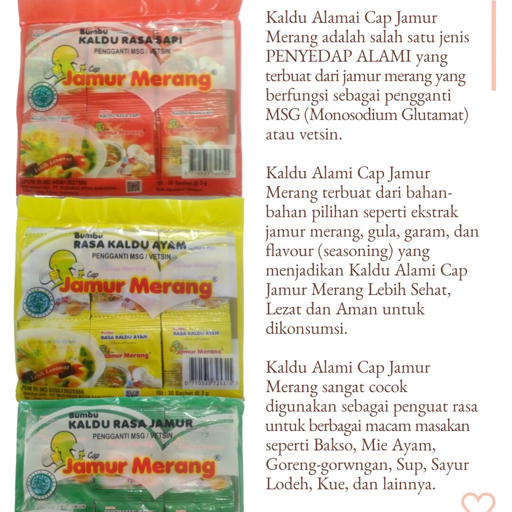 Kaldu Alami Cap Jamur Merang merupakan penyedap rasa jamur (mushroom seasoning) yang diproduksi sebagai jawaban atas kebutuhan masyarakat akan kaldu alami sebagai alternatif pengganti MOnosodium Glutamat (MSG) atau vetsin untuk mendapatkan makanan yang sehat dan lezat.