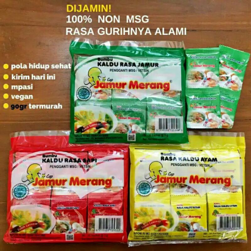 KALDU JAMUR MERANG ALAMI NON MSG/VETSIN dikemas dalam kemasan 3 gram, pas untuk sekali masak. Tepat untuk Bunda-bunda dan Kakak-kakak yang ingin mendapatkan penghasilan tambahan karena produk ini sangat laku di masa ketika banyak orang ingin hidup sehat tetapi tetap ingin menikmati masakan yang lezat.