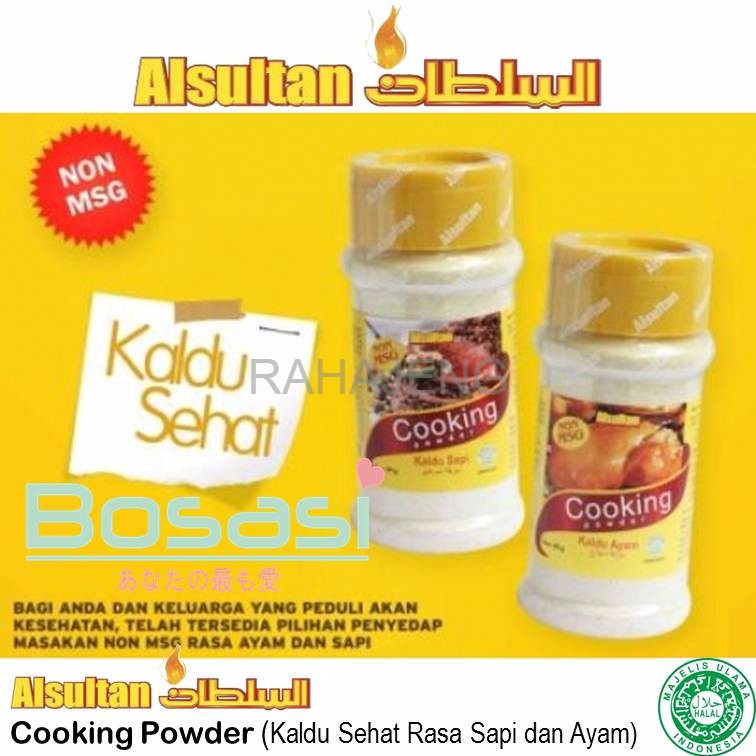 Kaldu Ayam dan Kaldu Sapi Alsultan merupakan penyedap masakan yang tidak mengandung vetsin atau lebih dikenal dengan sebutan MSG (Monosodium Glutamat). Dibuat dengan menggunakan campuran rempah-rempah khas Indonesia menjadikan masakan anda lezat, sehat dan aman dikonsumsi terutama untuk anak-anak dan orang dewasa yang tidak dapat mengkonsumsi vetsin.