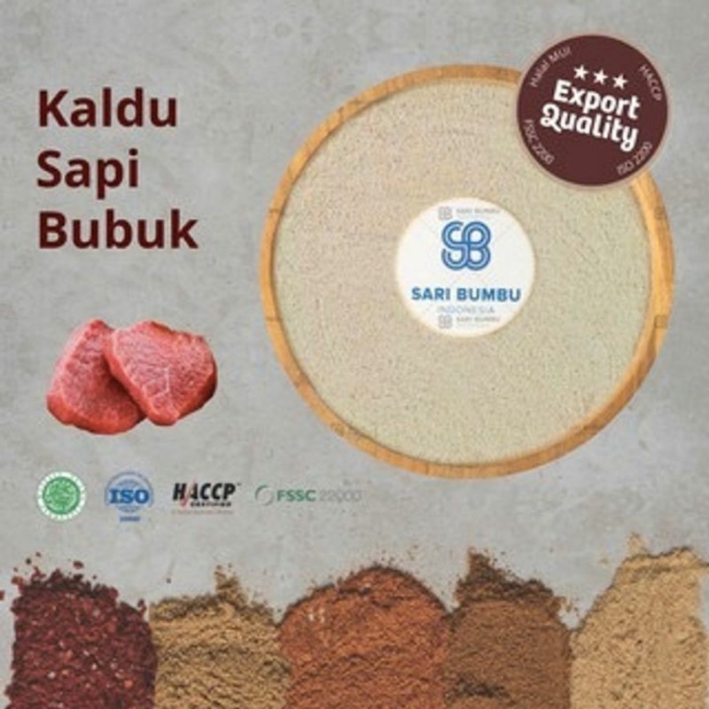 Kaldu Sapi Bubuk yang di proses dengan sangat higienis dengan standar mutu Internasional. Kaldu Sapi Bubuk ini murni tanpa campuran bahan kimia dengan komposisi Garam, Gula, Lemak & Ekstrak Sapi dan melewati 3 tahapan pembersihan dengan mesin standar produksi untuk Ekspor ke Jepang. Citara rasa original dengan aroma yang berkelas membuat bumbu ini biasa digunakan untuk masakan yang memiliki cita rasa khas dan biasa digunakan untuk Kuliner berkuah atau aneka hidangan lainnya.