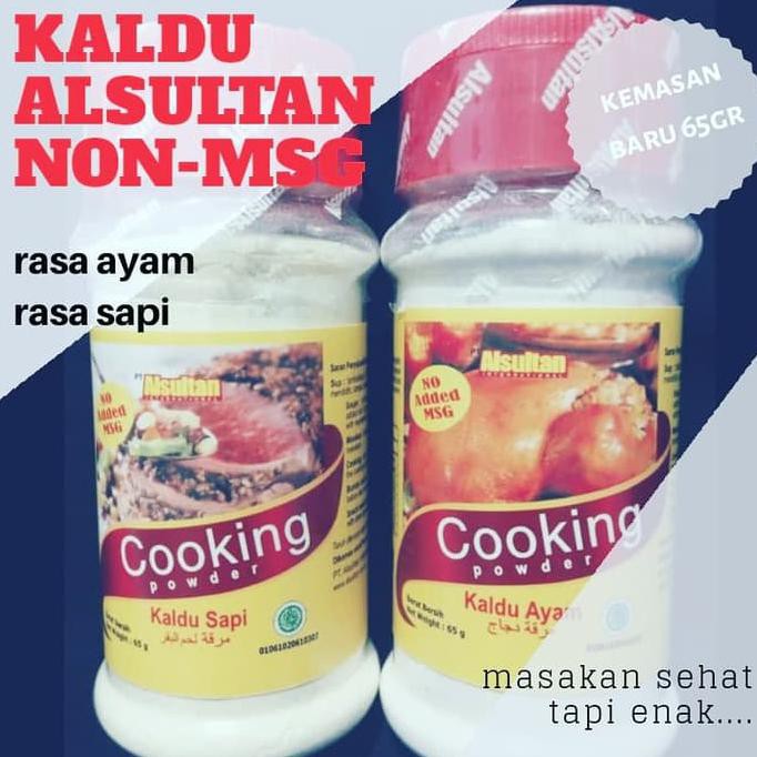 Alsultan kaldu ayam dan kaldu sapi non MSG merupakan penyedap masakan yang tidak mengandung vetsin atau lebih dikenal dengan sebutan MSG (Monosodium Glutamat). Dibuat dengan menggunakan campuran rempah-rempah khas Indonesia menjadikan masakan anda lezat, sehat dan aman dikonsumsi terutama untuk anak-anak dan orang dewasa yang tidak dapat mengkonsumsi vetsin.