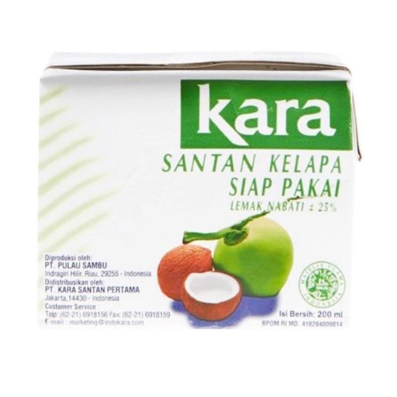 Kara Santan Kelapa [200 m;/ Pack] merupakan santan kelapa siap pakai yang terbuat dari air kelapa yang dikukur, diolah dan dikemas secara modern & higienis menggunakan sterilisasi tinggi (UHT), sehingga kesegaran & keaslian santan terjaga dengan baik, serta membuatnya tahan disimpan dalam waktu lama di dalam kulkas. Mengandung lemak nabati kurang lebih 25% dan juga dibuat tanpa pengawet sehingga aman digunakan. Jadikan Santan ini sebagai pengganti alternatif santan kelapa tradisional untuk menghasilkan masakan lezat bagi keluarga tercinta. Cocok digunakan untuk satu kali memasak, untuk 4-5 porsi.