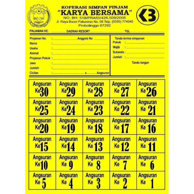 Kartu Angsuran Mingguan untuk Koperasi / Toko dan lain-lain