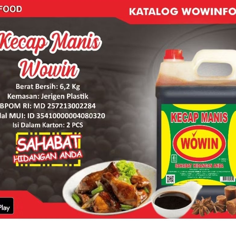 Kecap manis, termasuk produk Wowin, adalah cairan kental berwarna hitam ke merah kecoklatan yang terbuat dari fermentasi kedelai, gula, dan bumbu lainnya. Rasanya manis dan gurih, sering digunakan sebagai penyedap masakan, pelengkap hidangan, atau bahkan sebagai obat batuk alami.