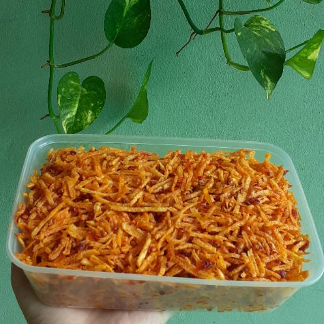 Kentang yang diparut dan di goreng garing lalu diberi bumbu balado. Teksturnya renyah, rasanya pedas manis dan gurih