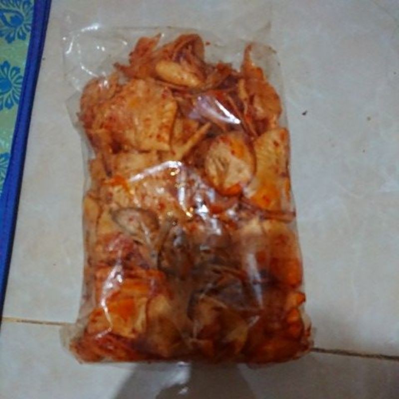 Keripik pedas Manis dengan toping teri yang di bungkus dengan kasih sayang. Perbungkus berat 500 gr