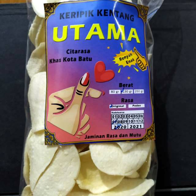 Keripik Kentang Utama rasa enak dan gurih.. Oleh2 khas Batu Malang harga 30.000. Berat/net wight 130 GR.