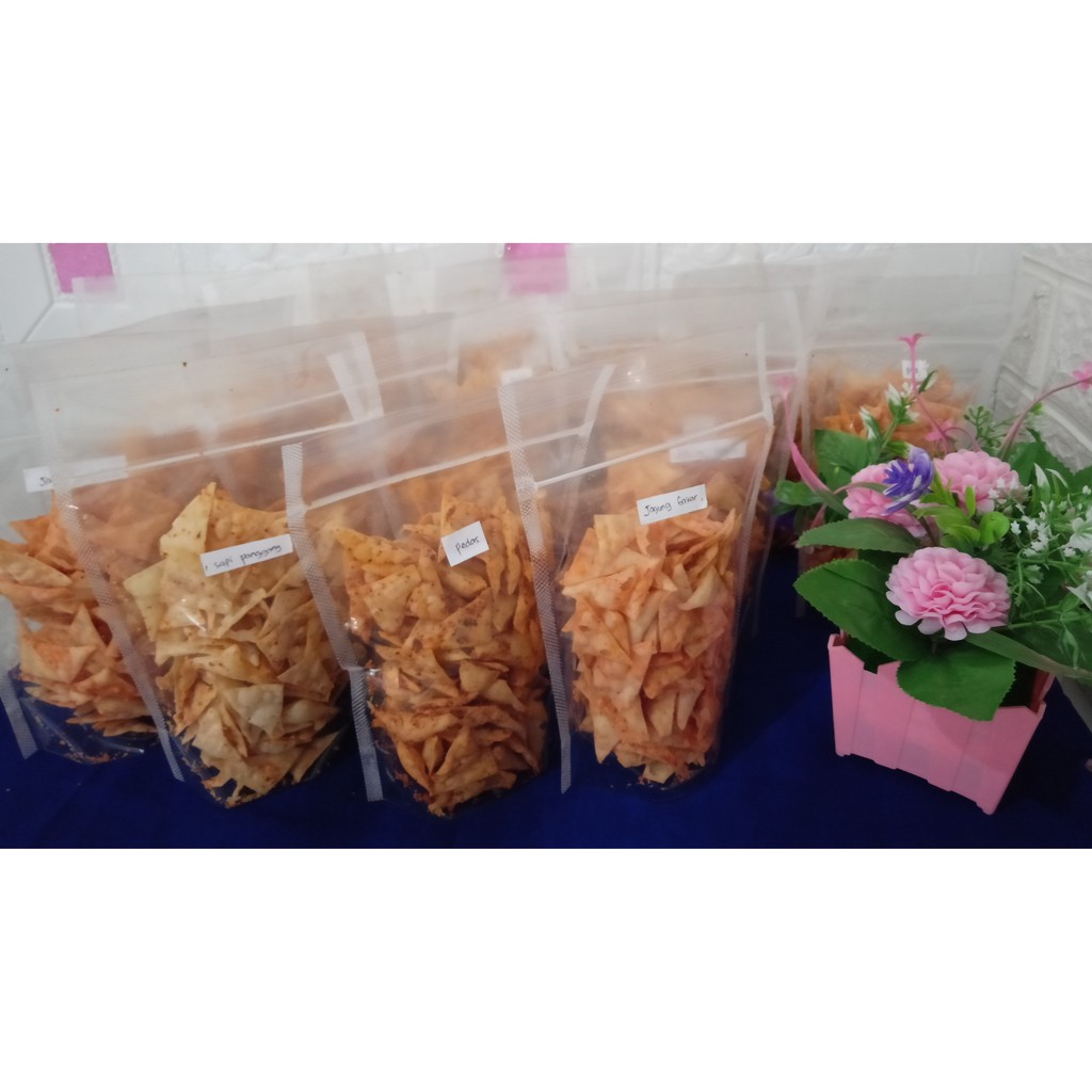 Keripik Pangsit pedasnya benar-benar poll! Camilan keripik yang renyah sudah pasti laku dinikmati saat kumpul bersama keluarga. Apalagi disungguhkan dengan cita rasa gurih pedas