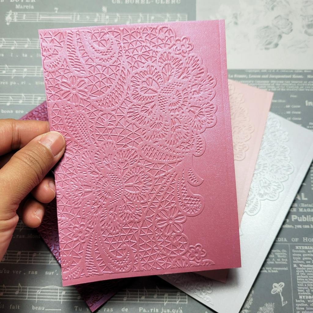 Kertas dengan motif timbul yang dapat digunakan untuk membuat kartu ucapan, undangan, cover, scrap, maupun prakarya kertas lainnya.