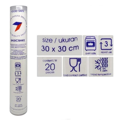 Baking Paper SEVEN Basic Bake dapat digunakan untuk memanggang segala jenis kue basah maupun kering. Bersertifikat food grade dan memiliki ketahanan pada suhu beku -18C hingga suhu oven 220 C.