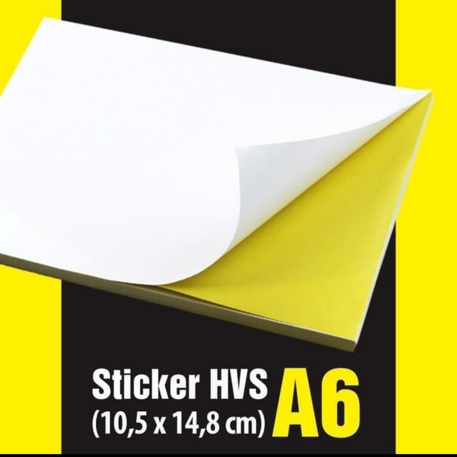 * stiker hvs (doff/matte) ini bagian depan warna putih yang digunakan sebagai media (bisa ditulis atau di cetak/di print) dan bagian belakang berwarna kuning sebagai pelapisnya.