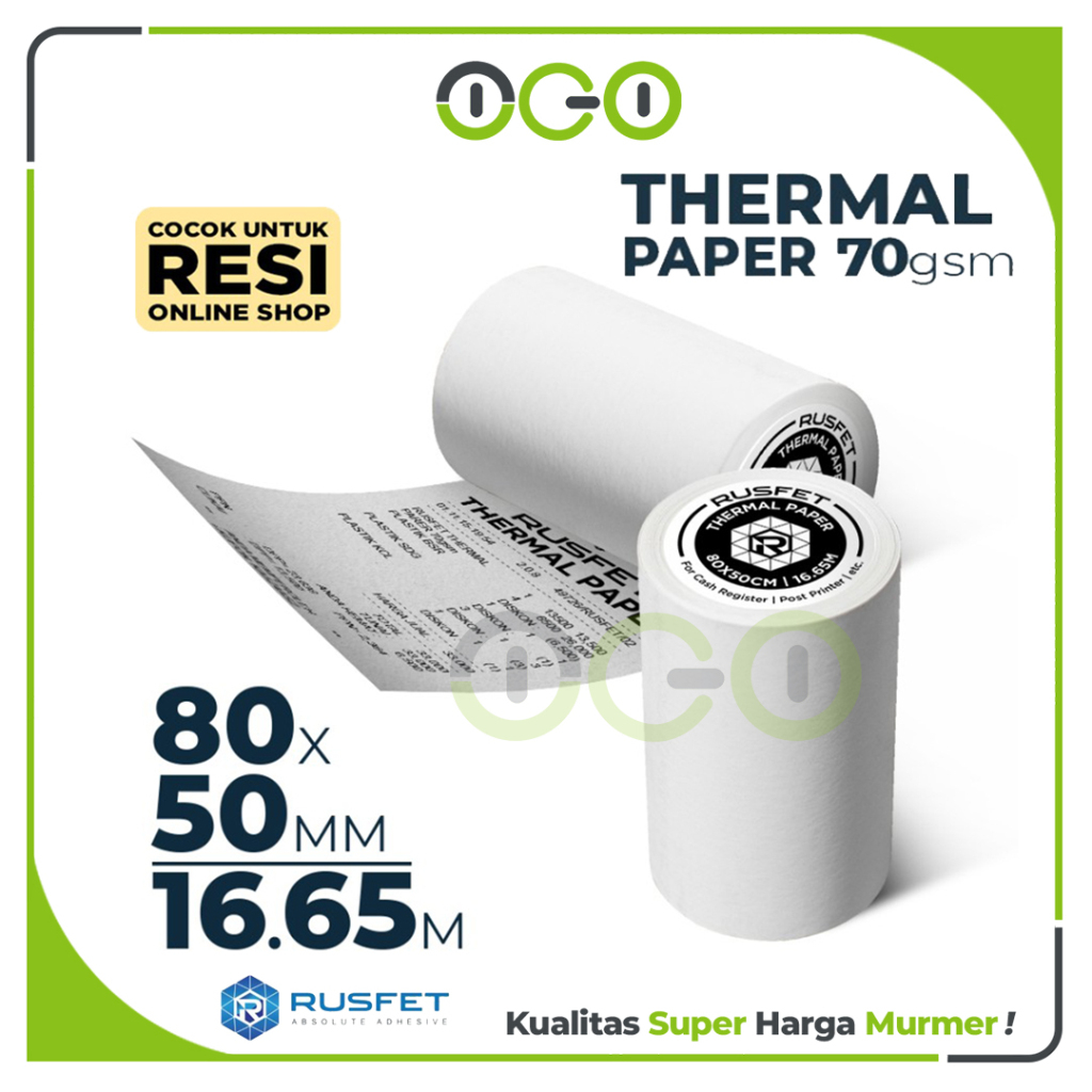 Kertas Thermal 80mm x 50mm - 16,6 meter Core termal Paper Sticker Label Printer Resi Per Roll RUSFET