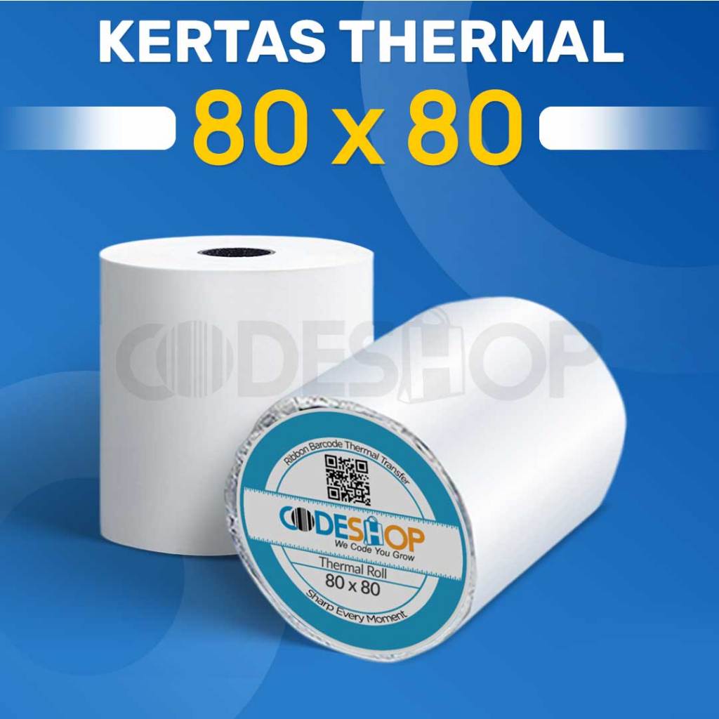 Ini adalah Kertas Thermal Codeshop Ukuran 80 x 80 mm. Kertas thermal adalah kertas yang sudah dilapisi bahan kimia thermal sehingga cukup dengan dipanaskan maka kertas bisa menghasilkan hasil cetak berupa tulisan huruf - angka - gambar - barcode satu warna. Kertas struk thermal biasa digunakan dalam printer kasir dan mesin ATM dengan ukuran lebar 80 mm.