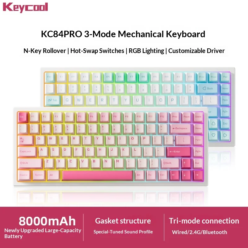 Keycool KC84 Pro Mechanical Keyboard 8000mAh Dynamic RGB Customized Hot Swappable BT 2.4g Wireless Connection Gasket 84% Layout