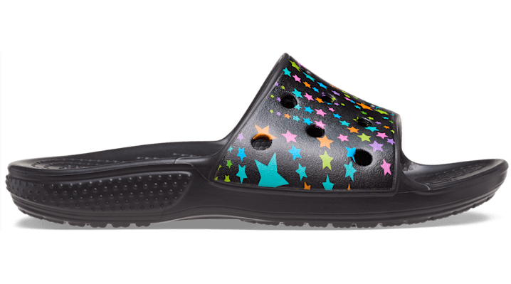 Original. Customizable. Comfortable. The Kids’ Classic Crocs Printed Slide is great for kids with big personalities. Why? Because it has holes for Jibbitz™ charms! Each slide has room for 13 charms so your kiddo can load up their sandals with tons of character. Original Croslite™ foam cushion will keep them comfortably supported from the beach to backyard gatherings and beyond. Let them choose their print and slide into a new favorite! Kids' Classic Crocs Printed Slide Details: Incredibly light and fun to wear Easy to clean and quick to dry Croslite™ foam footbeds for lasting comfort Customizable with Jibbitz™ charms Iconic Crocs Comfort™: Lightweight. Flexible. 360-degree comfort.
