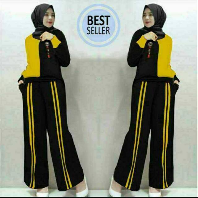 A11 KIKI SET MUSTARD-BLACK blouse Ld106 Pjg 65cm + kulot Pjg 95cm kantong kanan kiri pinggang karet, FULL Bahan babyterry Good Qualit + PET INPORT, all size fit to XL @128
