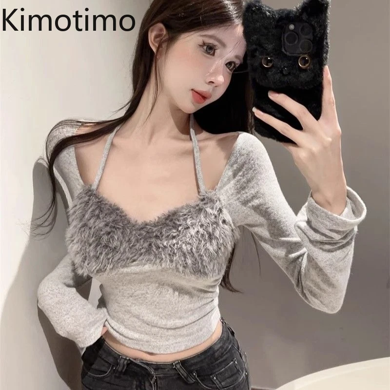 Kimotimo, серая лоскутная футболка с лямкой на шее и длинными рукавами, женская сексуальная облегающая нижняя укороченная футболка, осень-зима, уличная одежда Y2k для девочек
