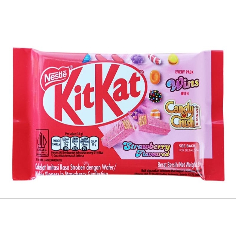 KitKat Cokelat Rasa Stroberi 35 g Cokelat persembahan Kit Kat yang hadir dengan varian rasa stroberi. Cita rasanya unik di lidah dan disukai terutama bagi para pecinta rasa coklat. Hadir dengan kemasan 35 gram, sehingga praktis untuk dibawa kemanapun dan dinikmati kapan saja. Dapatkan Kit Kat 35 g di sini!