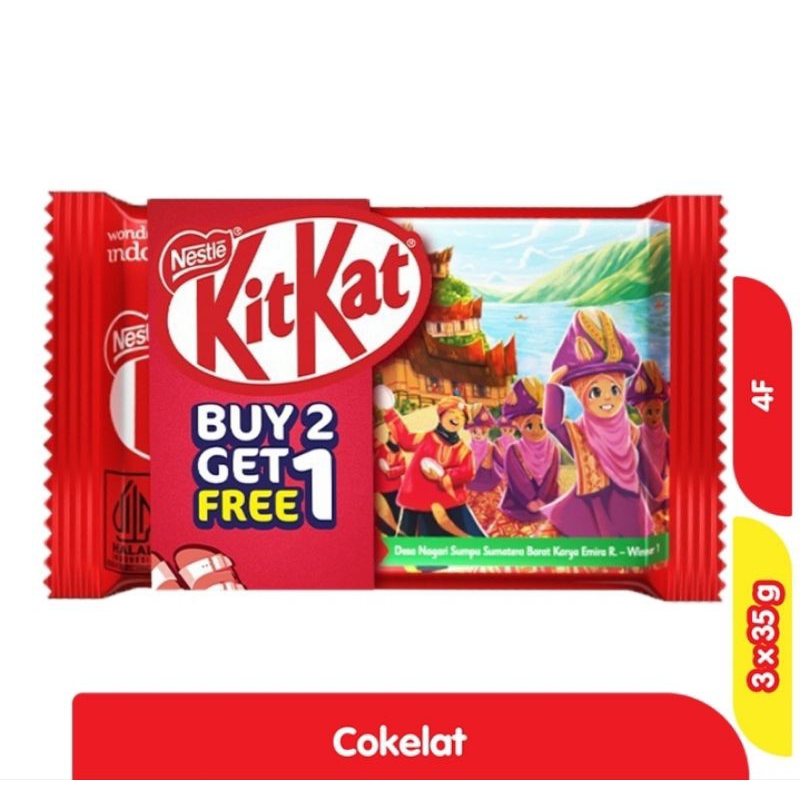 KitKat Wafer 4 Finger merupakan salah satu varian coklat KitKat dalam bentuk 4 bar yang unik atau lebih dikenal dengan sebutan 4 fingers yang mudah dipatahkan. Terbuat dari coklat dan bahan-bahan pilihan dan diproses serta dikemas secara higienis dan modern. KitKat memadukan krim coklat dari Nestle yang lezat dan wafer renyah yang menghasilkan citarasa yang istimewa di mulut