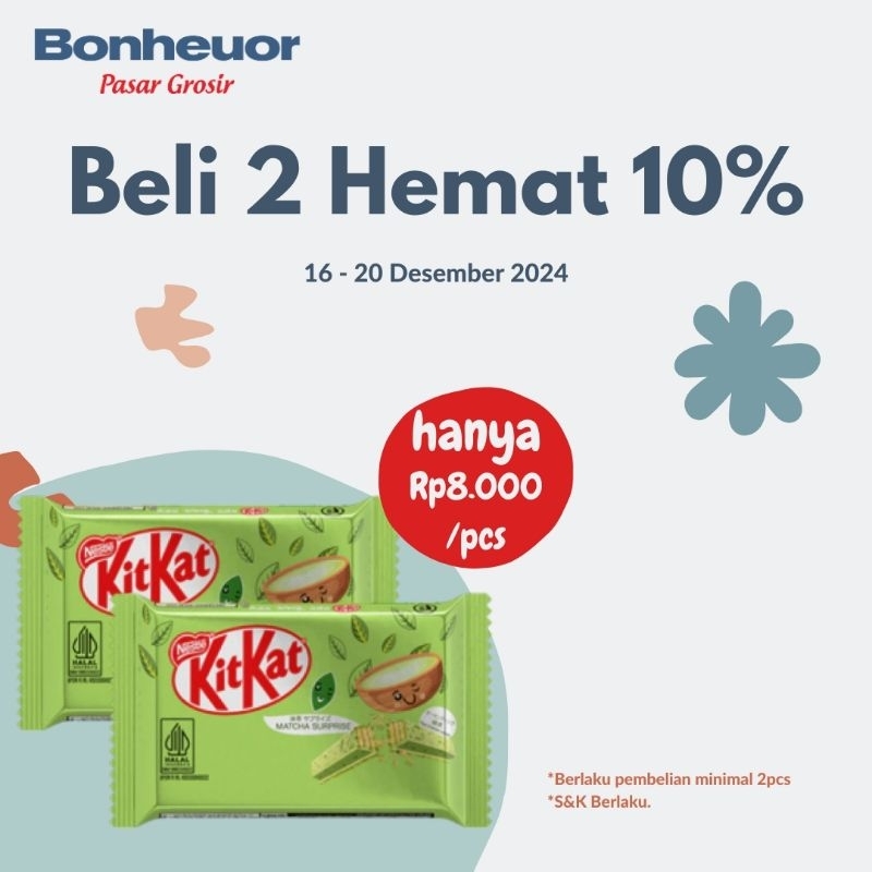 Nikmati kejutan edisi terbatas dari KitKat Matcha Green Tea buat break-mu semakin menyenangkan. Dengan resep dan rasa khas perpaduan cokelat dan rasa matcha dari daun teh asli dan bubuk teh hijau membuat pengalaman break-mu serasa di jepang. It's a surprise break for you!