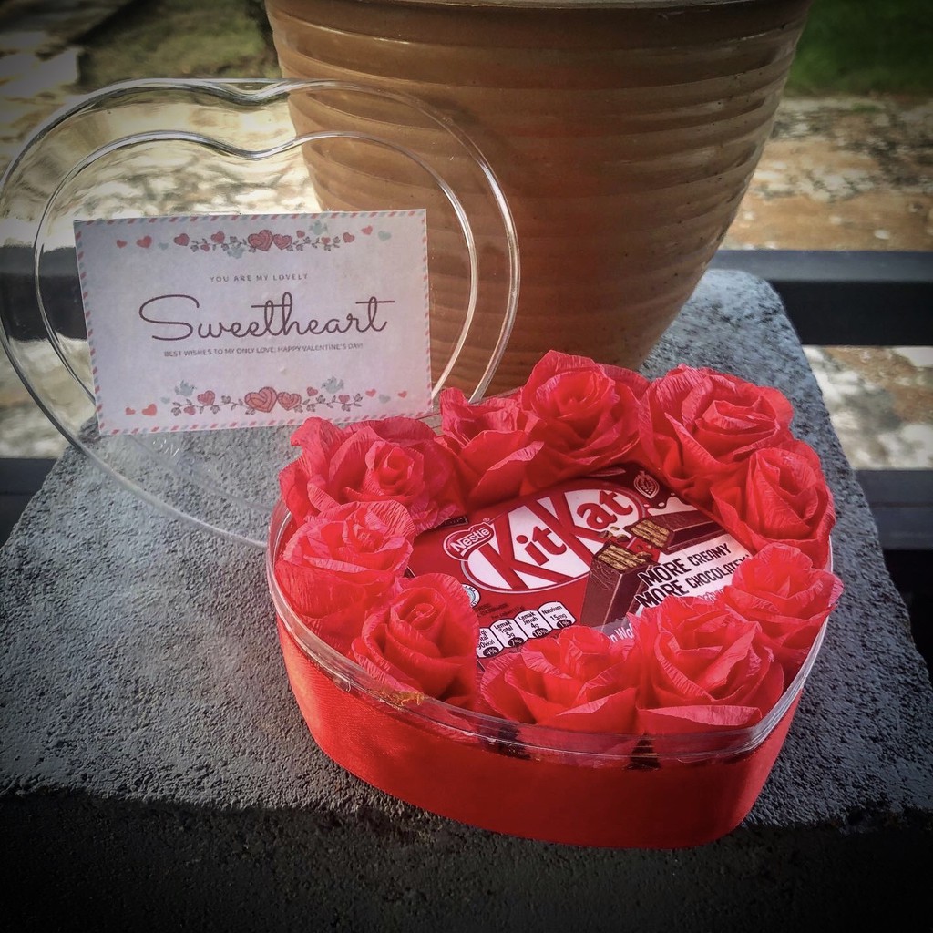 Kitkat yang dibungkus dengan banyak bunga mawar indah membentuk hati.