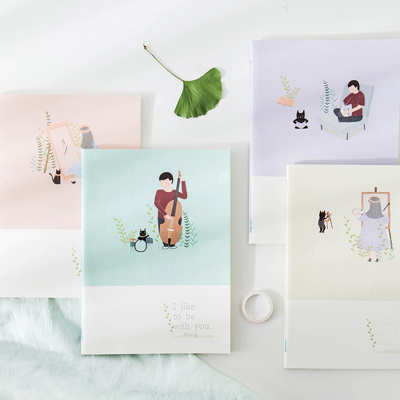 Buku tulis bergaris yang memiliki warna-warna lembut. Sampulnya memiliki gambar seseorang yang sedang bermain cello, menari, menggambar dan bermain ditemani oleh seekor kucing hitam yang lucu. Setiap lembar kertasnya dijilid dengan jahitan benang agar tidak mudah terlepas.