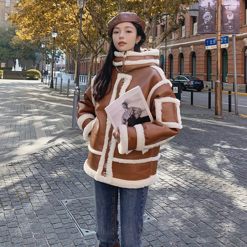 KoHuiJoo овчинные женские мотоциклетные овчины меховое пальто Зимняя замшевая куртка Женская Толстая теплая Модная Верхняя одежда с капюшоном