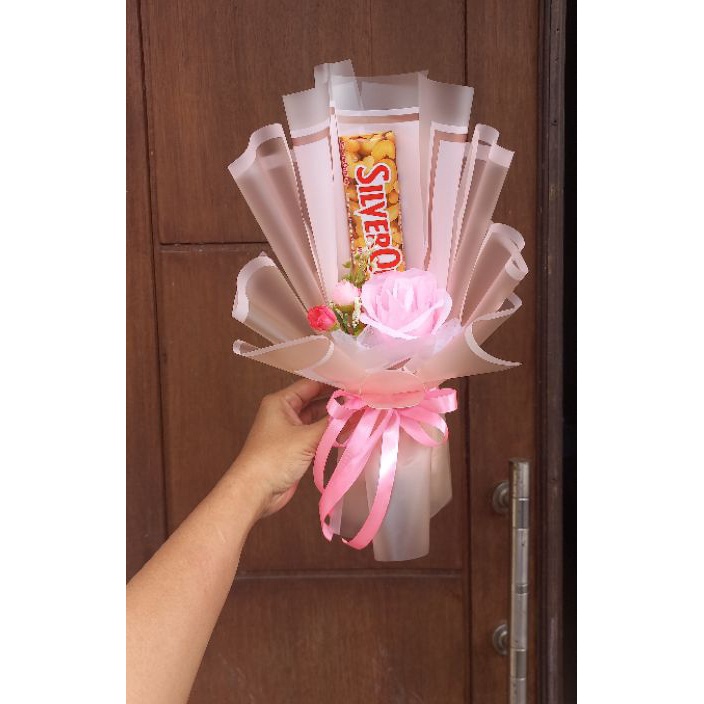 Bucket bunga cantik dengan tambahan coklat silverqueen bisa menjadi hadiah wisuda, ultah,dll untuk teman dan orang² tersayang