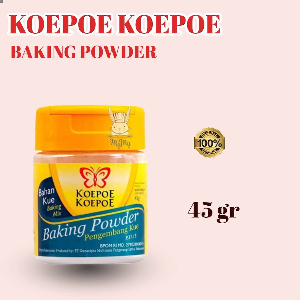Baking powder Koepoe Koepoe digunakan untuk mengembangkan berbagai macam adonan kue, bolu, roti, dan biskuit. Dibuat dari bahan pilihan yang bermutu tinggi untuk kesempurnaan kue anda.