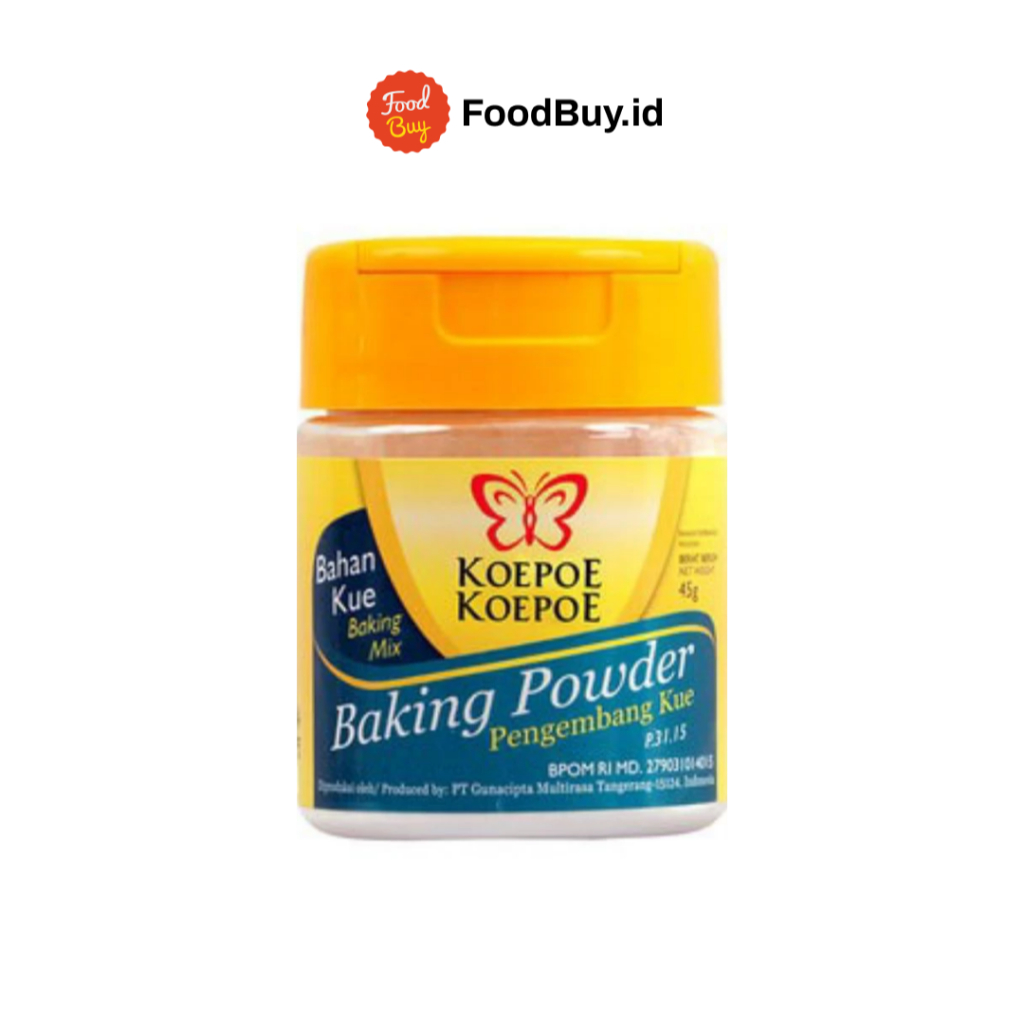 Baking powder Koepoe Koepoe digunakan untuk mengembangkan berbagai macam adonan kue, bolu, roti, dan biskuit. Dibuat dari bahan pilihan yang bermutu tinggi untuk kesempurnaan kue Anda.