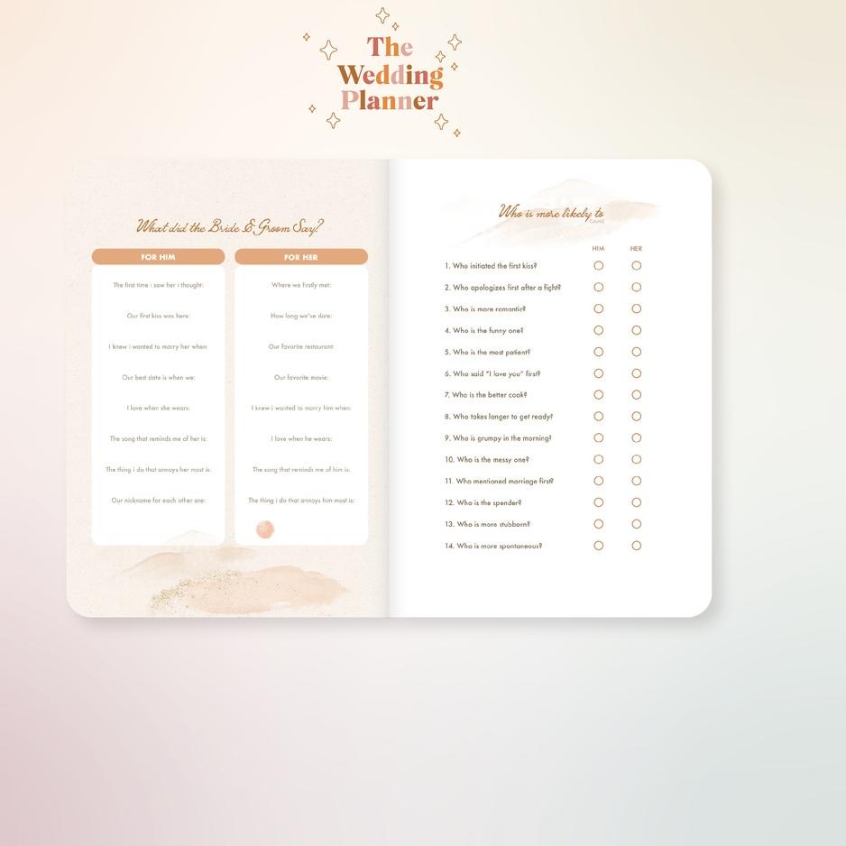 BUDAYAKAN MEMBACA SEBELUM MELAKUKAN PEMBELIAN Paperie Lab - The Wedding Planner The ultimate wedding planner - beautiful, functional, and long-lasting. Keep all your wedding day planning in one place. Key Features: - A5 Size (15x21cm), Hard covered with perfect-bound finishing & rubber band - 2022-2023 Calendar - Interactive Pages - Budgeting - Moodboard & Inspirations - Vendors - Guest Lists - Monthly Planner - Notes - Fast respon jam kerja Senin - Jumat pukul 9.00 - 17.00, Sabtu pukul 9.00 - 14.00, Minggu atau hari libur Off - Mohon mencantumkan warna/gambar/varian pilihan dan cadangannya (jika ada) di kolom pemesanan ya. Jika tidak mencantumkan pilihan, maka akan kami kirimkan sesuai stok yang ready!!! - Pengiriman pada H+1 (malamnya). - Jika barang yang di pesan kosong dan tidak ada respon selama 1x24 jam maka akan di kirim secara random. - Periksa kembali NOMOR HP (TELP) & ALAMAT LENGKAP. Guna mempercepat dan memperlancar pengiriman. - BARANG YANG SUDAH DI BELI TIDAK BISA DI KEMBALIKAN. - Gudang kita ada di DKI Jakarta, Jawa Timur, Jawa Tengah, Jawa Barat dan lainnya. Jadi pengiriman tidak selalu sesuai alamat toko ini yaaa.. >>>> MEMBELI = SETUJU