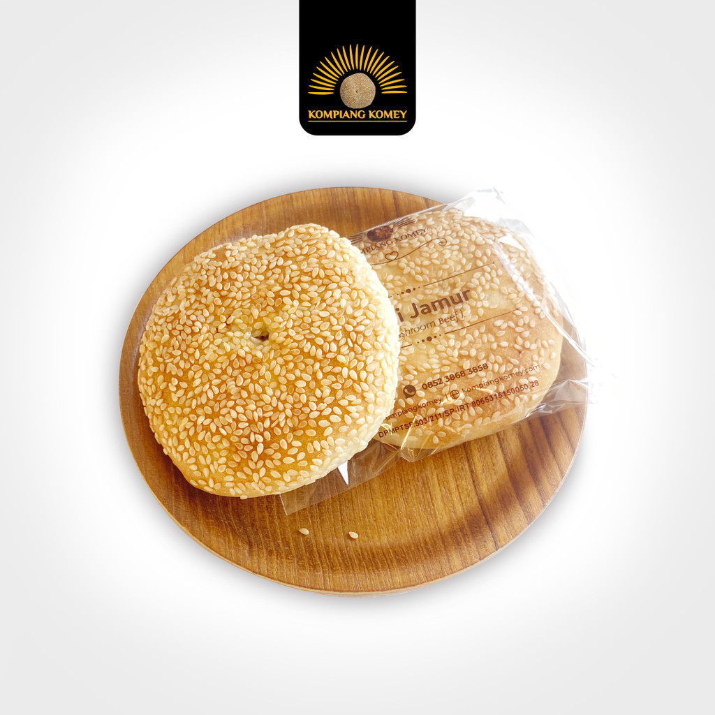 Kompiang Komey Rasa Sapi Jamur, dibuat dengan resep tradisional, tanpa bahan pengawet, dengan komposisi terigu, air, gula, dan garam, daging sapi berkualitas.