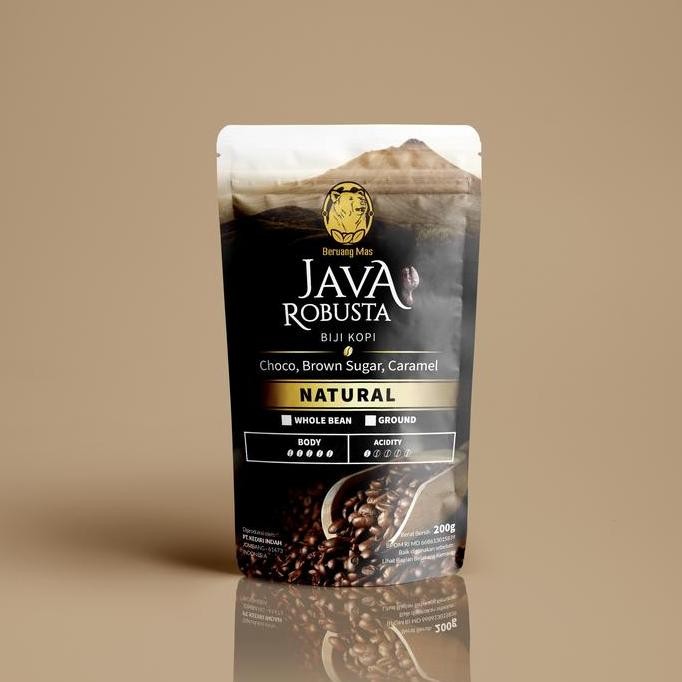 Kopi Java Robusta Beruang Mas adalah kopi robusta Jawa yang diproses secara natural dan ditanam di perkebunan kopi di Pulau Jawa dengan ketinggian 700 mdpl. Karakteristiknya full body dan sedikit keasaman dengan aroma cokelat, gula merah, dan karamel. Body: 5/5, Acidity: 1/5. Berat bersih 200 g.