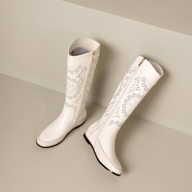 Krazing Pot Кожа спилка коровы Круглый носок Размер 43 Летние сапоги Модные рыцарские сапоги Полые украшения Осенние сапоги Ботфорты 43 слоновая кость