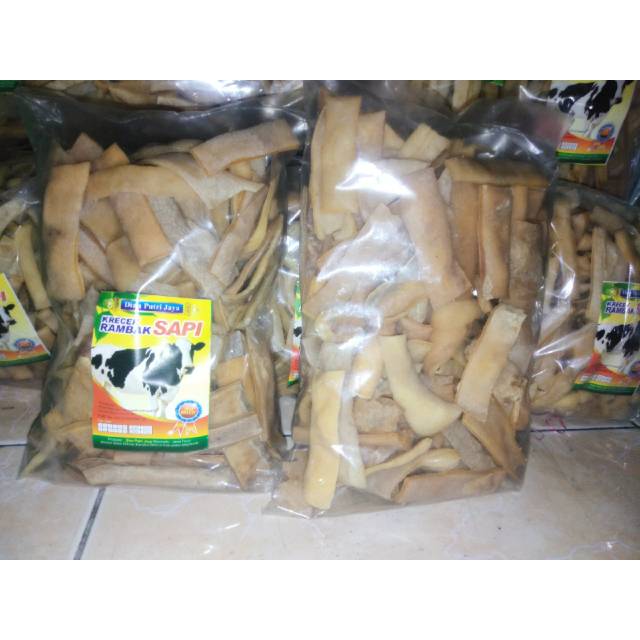 Produsen krecek rambak kulit sapi asli ! Krecek rambak kulit sapi asli bentuk STIK LEBAR tanpa bahan campuran , di olah secara higenis , rasanya gurih dan sangat enak cocok buat camilan , dan untuk oleh oleh isi perkemasn 500 gram. Langsung goreng krupuknya akan mengembang sempurna