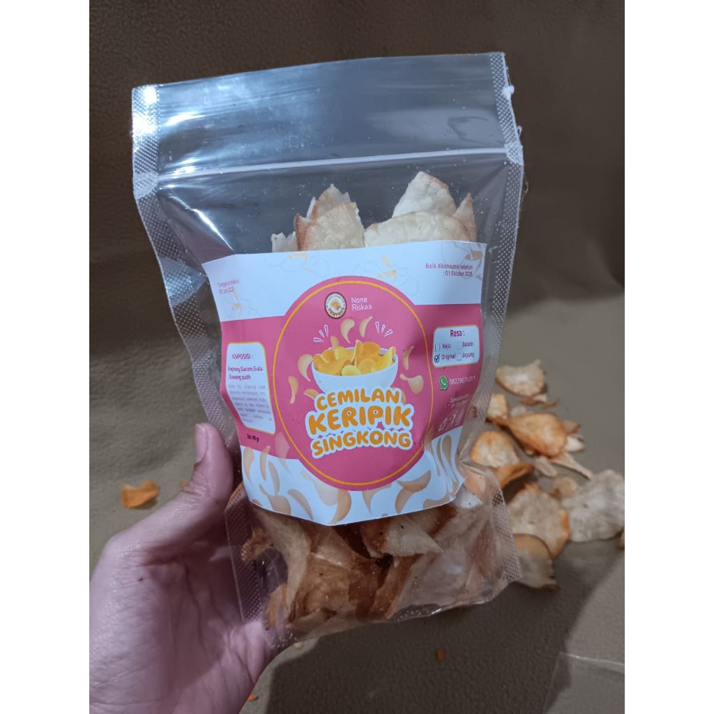 Kripik singkong camilan renyah yang terbuat dari irisan tipis singkong yang digoreng hingga kering dan berwarna keemasan.