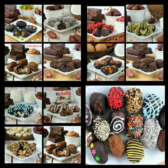 Kurma Cokelat Homemade menggunakan kurma asli berkualitas terdiri dari 28 rasa dengan celupan cokelat yang lezat dan topping yang varian