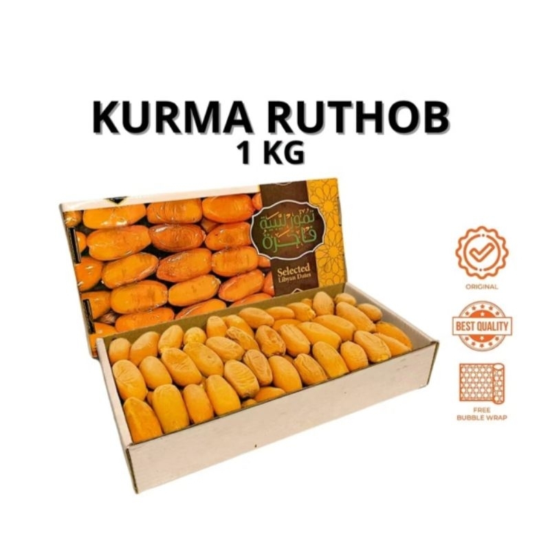 Buah kurmanya besar dan segar. Kurma Ruthob merupakan kurma basah dengan teksturnya masih renyah layaknya tomat mentah, tidak seperti kurma matang yang sudah lembek dan sedikit liat. Sementara rasanya tidak terlalu manis dan ada sedikit sepat seperti buah sawo. Buahnya lonjong dan berwarna kuning.